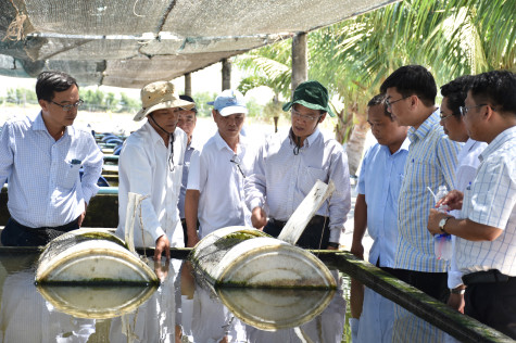 Lãnh đạo Sở NN&PTNT tham quan mô hình nuôi lươn theo công nghệ tuần hoàn nổi của hộ ông Phan Khắc Nhật Tiến.