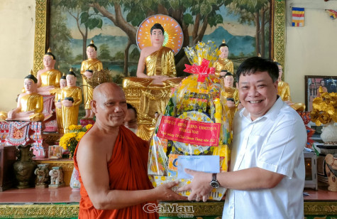 (CMO) Nhân dịp Tết cổ truyền Chôl Chnăm Thmây năm 2022 của đồng bào Khmer, sáng 16/4, đoàn cán bộ Tỉnh uỷ, HĐND, UBND, Uỷ ban MTTQ Việt Nam tỉnh Cà Mau, do Phó bí thư Thường trực Tỉnh uỷ Phạm Thành Ngại làm trưởng đoàn, đã đến thăm, chúc Tết tại chùa Monivongsa (Phường 1, TP.Cà Mau).