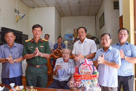 Phó Bí thư Thường trực Tỉnh uỷ Huỳnh Quốc Việt trao phần quà tri ân của Tỉnh uỷ - HĐND - UBND - Uỷ ban MTTQ Việt Nam tỉnh Cà Mau đến thương binh Trần Công Bình (ấp Sở Tại, Xã Lương Thế Trân).