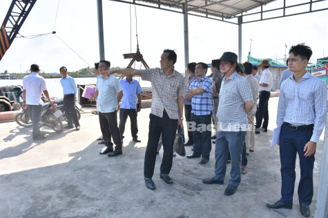 Phó Chủ tịch UBND tỉnh - Huỳnh Chí Nguyện cùng các thành viên trong đoàn kiểm tra thực tế việc thi công, khắc phục các điểm xói lở ở cảng cá Gành Hào.