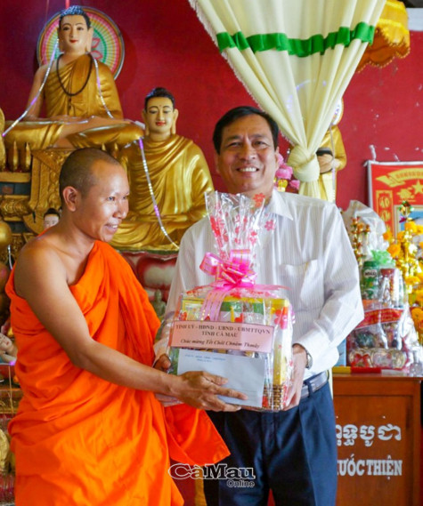| Phó chủ tịch UBND tỉnh Cà Mau Trần Hồng Quân tặng quà và chúc Tết Chôl Chnăm Thmây tại chùa Rạch Cui (xã Khánh Bình Đông, huyện Trần Văn Thời). |