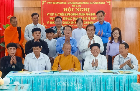 Đại diện Ủy ban MTTQ Việt Nam tỉnh Cà Mau, Sở Tài Nguyên Môi trường và các tổ chức tôn giáo ký kết Chương trình phối hợp phát huy vai trò các tôn giáo tham gia bảo vệ môi trường và thích ứng biến đổi khí hậu, giai đoạn 2023-2026.