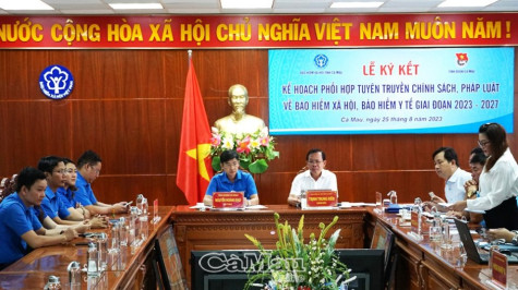 Báo Cà Mau (CMO) Chiều 25/8, hai đơn vị Bảo hiểm xã hội tỉnh và Tỉnh đoàn tổ chức ký kết Kế hoạch phối hợp tuyên truyền chính sách, pháp luật về bảo hiểm xã hội, bảo hiểm y tế (BHXH, BHYT) giai đoạn 2023-2027. Buổi lễ được kết nối trực tuyến với điểm cầu BHXH các huyện.