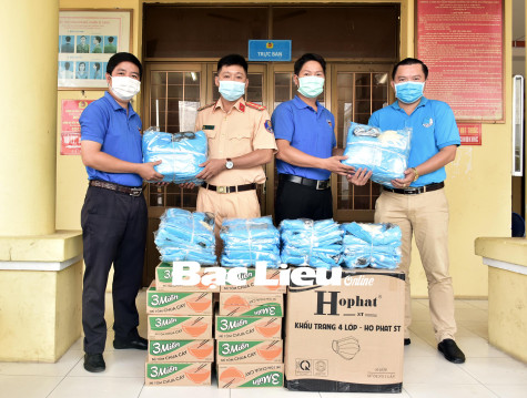 (BL-HT) Chiều 20/7, Đoàn Thanh niên và Hội Phụ nữ Phòng Cảnh sát Giao thông đường bộ Công an tỉnh tổ chức trao tặng vật dụng y tế, nhu yếu phẩm gồm: 60 bộ quần áo bảo hộ, 50 hộp khẩu trang y tế và 10 thùng mì cho Huyện đoàn Hòa Bình - ảnh. Tổng trị giá các phần quà là 22 triệu đồng, do Phòng Cảnh sát Giao thông đường bộ vận động các mạnh thường quân ngoài tỉnh.