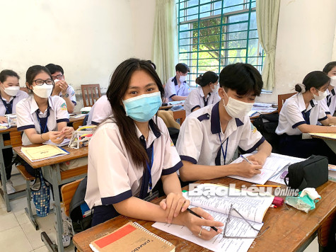Học sinh Trường THPT Nguyễn Trung Trực (TX. Giá Rai) đeo khẩu trang trong giờ học (ảnh chụp ngày 21/4/2023). Ảnh: C.K