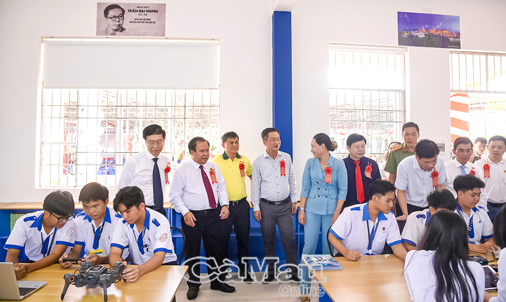 Lãnh đạo Tập đoàn Công nghiệp - Năng lượng quốc gia Việt Nam (Petrovietnam) và lãnh đạo UBND tỉnh Cà Mau tham quan Phòng học STEM đạt chuẩn quốc tế tại Trường THPT Võ Văn Kiệt. Ảnh: HỮU THỌ