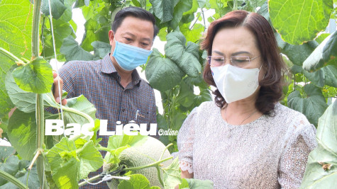 Phó Bí thư Thường trực Tỉnh ủy - Lê Thị Ái Nam tham quan mô hình trình diễn trồng dưa lưới trong nhà kín của Hội Nông dân tỉnh.