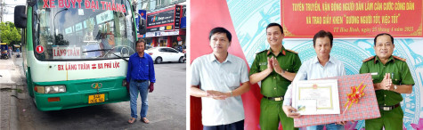 Tài xế Nguyễn Trường An bên xe buýt (ảnh trái) và nhận khen thưởng của Công an huyện Hòa Bình. Ảnh: T.H