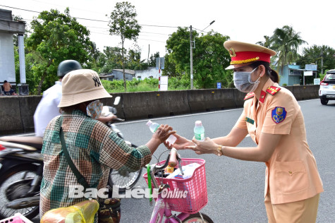 Nữ Cảnh sát giao thông tặng nước suối cho lao động nghèo. Ảnh: T.H
