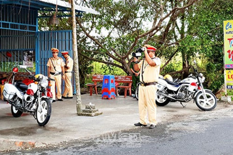 | Lực lượng Cảnh sát giao thông trật tự Công an huyện Phú Tân thường xuyên tuần tra kiểm soát các tuyến đường trọng điểm. |