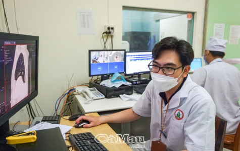 Bác sĩ Bệnh viện Đa khoa tỉnh đọc kết quả chụp CT kiểm tra tổn thương phổi và tim của bệnh nhân.
