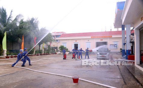 Cán bộ, nhân viên thực hành xử lý tình huống phòng cháy, chữa cháy tại kho xăng dầu chiến thuật.