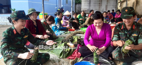 Lực lượng vũ trang và các đoàn thể huyện Phước Long tham gia gói bánh tét cùng người dân địa phương (ảnh trên) và giúp dân duy tu, dặm vá lộ nông thôn xuống cấp (ảnh dưới). Ảnh: C.L - Q.V