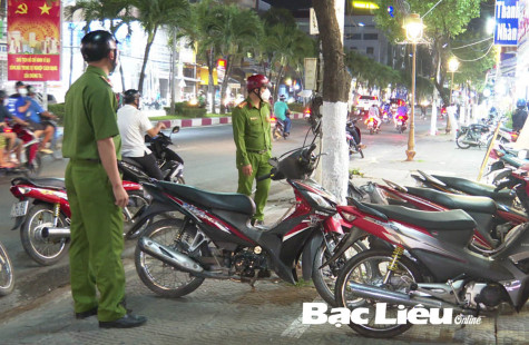 Công an Phường 7 (TP. Bạc Liêu) kiểm tra, nhắc nhở các hộ kinh doanh đậu đỗ xe đúng nơi quy định. Ảnh: Hồng Thơ