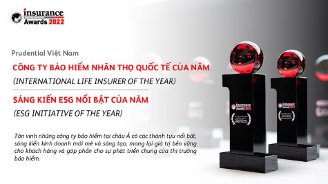 (CMO) Ngày 22/8/2022, Công ty TNHH Bảo hiểm Nhân thọ Prudential Việt Nam (Prudential) vừa được vinh danh với hai giải thưởng “Công ty bảo hiểm nhân thọ quốc tế của năm” và “Sáng kiến ESG của năm” tại Insurance Asia Awards 2022. Đồng thời, công ty cũng được ghi nhận là “Nơi làm việc tốt nhất châu Á” bởi HR Asia Awards 2022.