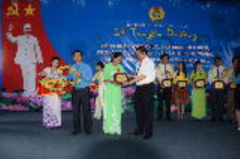 | Phó chủ tịch UBND tỉnh Cà Mau Thân Đức Hưởng tặng biểu trưng và Chủ tịch LĐLĐ tỉnh Châu Thành Tôn tặng hoa cho 60 cá nhân tiêu biểu; có thành tích trong học tập và làm theo tư tưởng, đạo đức, phong cách Hồ Chí Minh năm 2017. |