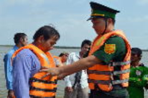 | Cán bộ Đồn Biên phòng Sông Đốc hướng dẫn ngư dân mặc áo phao khi hoạt động trên biển. |