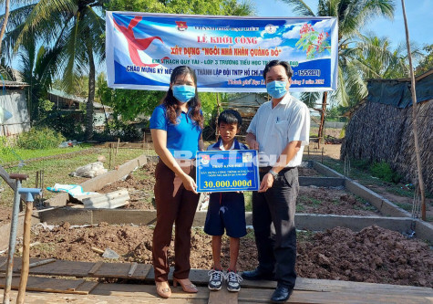 Trao kinh phí và khởi công xây dựng “Ngôi nhà Khăn quàng đỏ” cho em Thạch Quy Tài, lớp 3/3 Liên đội Trường tiểu học Trần Hưng Đạo (ấp Giáp Nước, xã Vĩnh Trạch, TP. Bạc Liêu). Ảnh: H.L