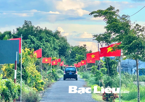 Một tuyến đường được treo cờ Tổ quốc trên địa bàn xã Ninh Thạnh Lợi (huyện Hồng Dân). Ảnh: H.T