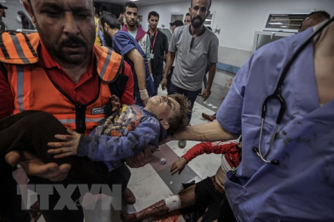 Chuyển em nhỏ bị thương trong vụ tấn công nhằm vào Bệnh viện Al-Ahli al-Arabi ở Gaza, đêm 17/10/2023. Ảnh: TTXVN