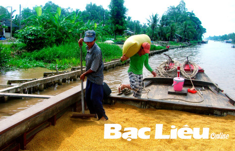 Nông dân huyện Phước Long bán lúa ST24 cho thương lái. Ảnh: T.A