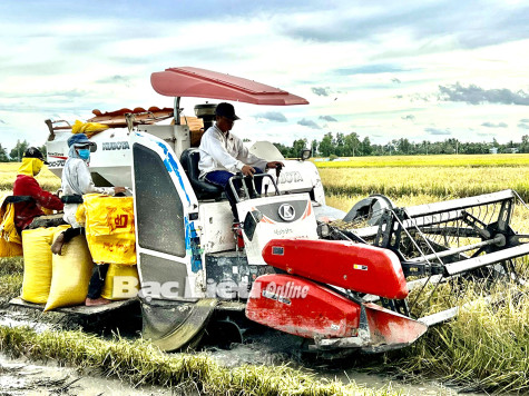 Nông dân Bạc Liêu thu hoạch lúa đông xuân 2022 - 2023 - một vụ lúa được xem là trúng mùa, trúng giá. Ảnh: K.T
