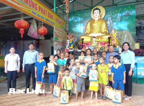 Quỹ Bảo trợ trẻ em tỉnh tặng quà cho trẻ tại Cơ sở nuôi dạy trẻ mồ côi Vĩnh Phước An tự (Phường 2, TP. Bạc Liêu). Ảnh: T.Q
