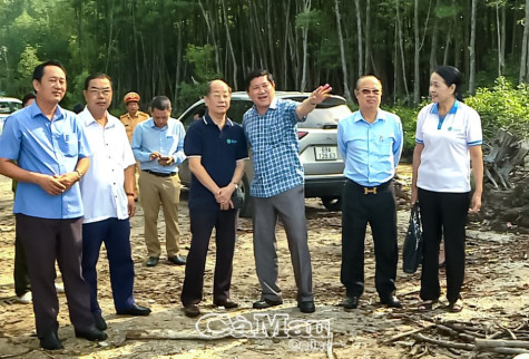 Phó chủ tịch UBND tỉnh Lê Văn Sử (thứ 3 từ phải sang) cùng Đoàn công tác Quỹ Cộng đồng phòng tránh thiên tai do ông Phan Diễn (thứ 4 từ phải sang), nguyên Uỷ viên Bộ Chính trị, nguyên Thường trực Ban Bí thư Trung ương Đảng, Chủ tịch Hội đồng quản lý Quỹ, làm Trưởng đoàn đến khảo sát thực tế điểm sạt lở, bờ kè chống sạt lở tại huyện Ngọc Hiển.