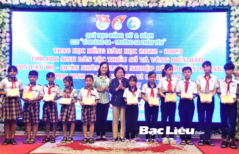 Bà Trương Mỹ Hoa - nguyên Bí thư Trung ương Đảng, nguyên Phó Chủ tịch nước, Chủ tịch Quỹ học bổng Vừ A Dính, Chủ nhiệm CLB “Vì Hoàng Sa - Trường Sa thân yêu” (bên phải) và bà Lê Thị Ái Nam - Phó Bí thư Thường trực Tỉnh ủy Bạc Liêu trao học bổng cho HS dân tộc có hoàn cảnh khó khăn.