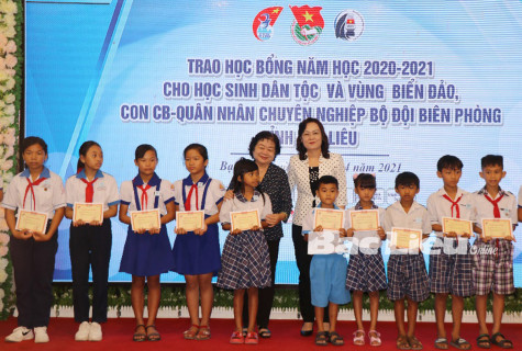 Bà Trương Mỹ Hoa - nguyên Bí thư Trung ương Đảng, nguyên Phó Chủ tịch nước, Chủ tịch Quỹ học bổng Vừ A Dính, Chủ nhiệm CLB “Vì Hoàng Sa - Trường Sa thân yêu” (bên trái) và bà Lê Thị Ái Nam - Phó Bí thư Thường trực Tỉnh ủy, Chủ tịch HĐND tỉnh Bạc Liêu trao học bổng cho học sinh dân tộc có hoàn cảnh khó khăn. Ảnh: H.L