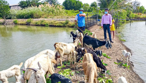 | Ông Lê Thanh Hải, ấp Thuận Long A, xã Tân Tiến bìa trái phát triển kinh tế vươn lên từ mô hình nuôi dê và đang hướng dẫn cách nuôi dê cho người dân. |