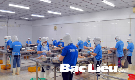 Công nhân chế biến, xuất khẩu thủy sản được trang bị bảo hộ lao động và làm việc đảm bảo an toàn phòng, chống dịch COVID-19. Ảnh: H.T