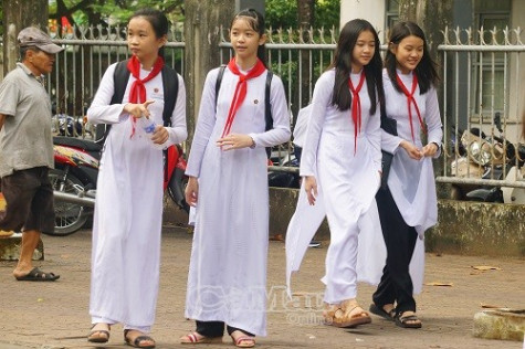 Học sinh khối lớp 6 trường THPT Hồ Thị Kỷ với vẻ mặt còn nhiều bỡ ngỡ, xúng xính trong tà áo dài.