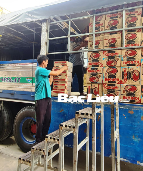 Nhân viên Công ty Cổ phần thương nghiệp Cà Mau - Chi nhánh Bạc Liêu vận chuyển hàng hóa cho các nhà phân phối. Ảnh: T.Q