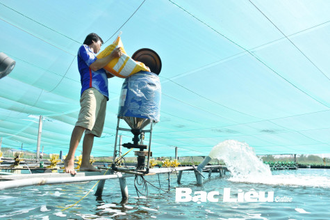 Một hộ nuôi tôm ở xã Hiệp Thành (TP. Bạc Liêu) tiếp thức ăn vào máy cho tôm ăn tự động.