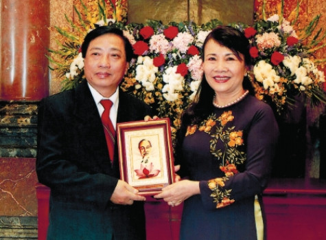 Tại Lễ Tuyên dương giáo viên tiêu biểu năm 2016, Thứ trưởng Bộ GD&ĐT Nguyễn Thị Nghĩa trao tặng bức ảnh chân dung Bác Hồ cho NGƯT Trương Quang Bộ. (Ảnh do nhân vật cung cấp). |