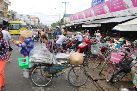 | Cảnh mua bán, đậu xe lộn xộn trước cổng vào khu B chợ Tắc Vân. |