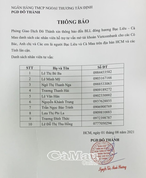 | Nhằm đảm bảo đúng quy định của pháp luật, đủ điều kiện chuyển tiền đến người được nhận cứu trợ (không chuyển qua người khác), Ban Liên lạc gửi kèm danh sách thông tin các thành viên của VCB Đô Thành sẽ gọi điện thoại, xác nhận thông tin để chuyển khoản. |