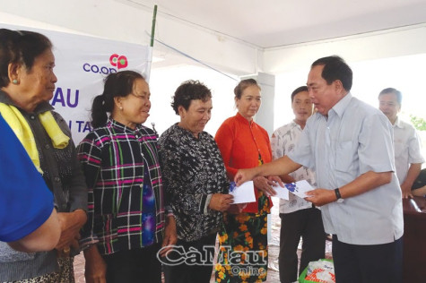 | Phó chủ tịch UBMTTQVN tỉnh Cà Mau Phan Mộng Thành cùng đại diện Siêu thị Co.opmart Cà Mau trao tiền và các nhu yếu phẩm cho 50 hộ dân xã Khánh Tiến, Khánh Hội. |