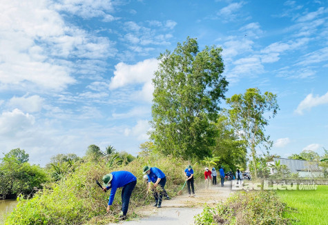 Đoàn viên - thanh niên và Nhân dân huyện Vĩnh Lợi ra quân phát quang bụi rậm ở tuyến đường giao thông nông thôn trên địa bàn. Ảnh: H.L