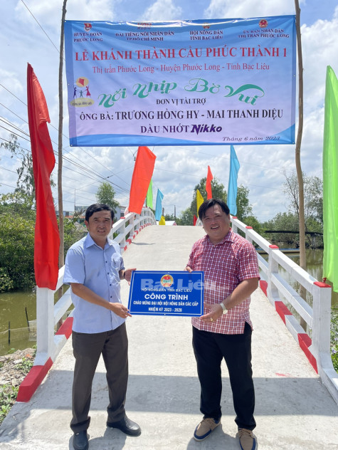 Ông Nguyễn Hoàng Thoại - Chủ tịch Hội Nông dân tỉnh (bên phải) bàn giao cầu Phúc Thành 1 (thị trấn Phước Long, huyện Phước Long) cho UBND thị trấn Phước Long.