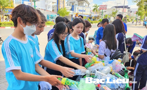 Nhiều Gen Z tập kết rác thải nhựa để chuẩn bị cho hoạt động đổi rác lấy cây xanh do Thành đoàn TP. Bạc Liêu tổ chức. Ảnh: Đ.K.C