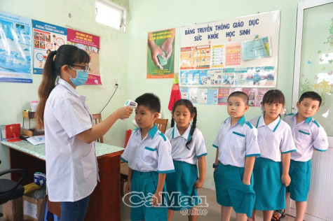 Đo thân nhiệt và kiểm tra sức khoẻ học sinh khi các em có dấu hiệu mệt mỏi, nóng sốt. (Ảnh chụp tại Trường Tiểu học Lê Quý Đôn, Phường 9, TP Cà Mau). |