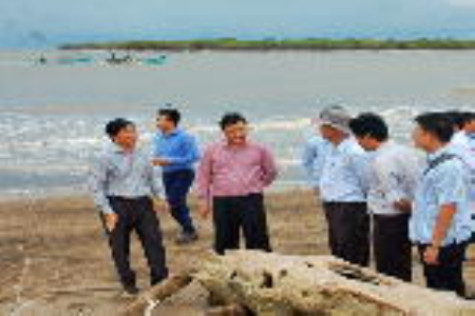 | Phó Tổng Cục trưởng Tổng Cục Thuỷ lợi Trần Quang Hoài (thứ ba từ trái sang) cùng lãnh đạo tỉnh Cà Mau khảo sát tình hình sạt lở đê biển Đông.Ảnh: TRUNG ĐỈNH |