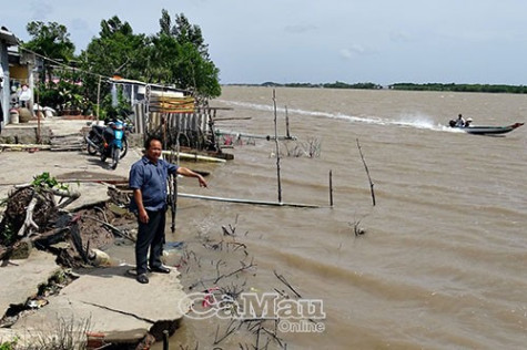 Sát bờ sông, thay vì là lộ bê tông, một chiếc cầu cây khoảng mười mấy mét, vắt ngang cửa đâu 3-4 ngôi nhà, được bà con chung tay bắc tạm để đi lại từ ngày con lộ mất. Dắt xe đến giữa lưng chừng cầu, chúng tôi được đón tiếp bằng tiếng chó sủa ầm ĩ trong căn nhà kín mít cửa. Tiếng nạt "Lu, gì đó!" báo hiệu trong nhà có người. Tôi cùng anh Quân, công chức phụ trách xây dựng - hạ tầng của UBND thị trấn Năm Căn, được một người đàn ông đứng tuổi lịch sự mời vào nhà.