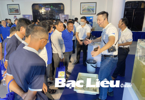 Doanh nghiệp giới thiệu quy trình nuôi tôm sạch cho nông dân Bạc Liêu. Ảnh: K.T