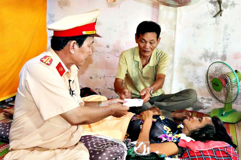 | Đại diện Ban ATGT tỉnh Cà Mau đến thăm hỏi hoàn cảnh bà Phạm Thị Mai, ngụ ấp Tân Điền, xã Tân Duyệt, huyện Đầm Dơi (bà Mai bị chấn thương sọ não do TNGT). |