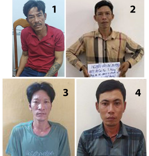 | Các đối tượng: 1/ Lâm Văn Lam, 2/ Nguyễn Văn Bé, 3/ Lê Hoàng Nam, 4/ Nguyễn Thanh Sang. (Ảnh do Công an cung cấp) |