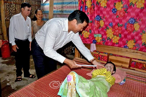 | Phó chủ tịch UBND tỉnh Thân Đức Hưởng thăm và tặng quà cho nạn nhân Lâm Trà My, ấp Tân Thời, xã An Xuyên, TP Cà Mau. Ảnh: Hoàng Vũ |