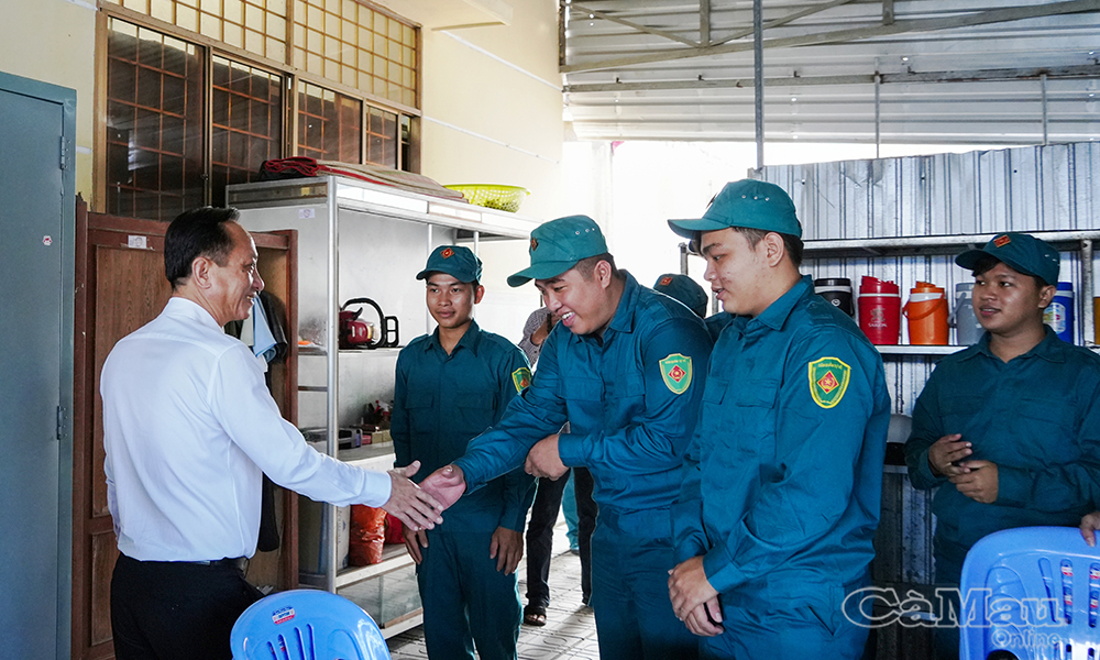 Đồng chí Phạm Văn Thiều, Phó Bí thư Tỉnh uỷ, Chủ tịch HĐND tỉnh Cà Mau (bìa trái), động viên lực lượng Dân quân tự vệ, Ban Chỉ huy Quân sự xã Phú Mỹ.